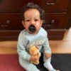 - Presents: a baby’s bottle, a pacifier, a birth card, random clothes.